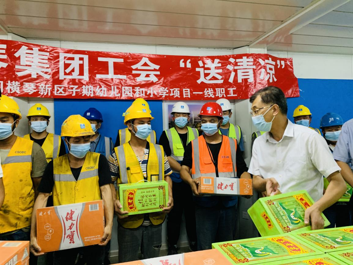 為進一步加強高溫作業(yè)職工勞動保護工作,關愛堅守在項目一線的建設者,2021年7月,大橫琴集團黨委書記、工會主席田偉帶隊分別赴科學城(二期)標段一、標段二項目、橫琴醫(yī)院項目、橫琴新區(qū)子期幼兒園和小學及保稅一小工程項目開展夏日送清涼慰問活動。