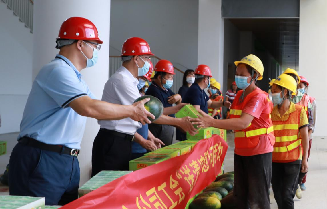 在項目現(xiàn)場,慰問組一行與項目負責人深入交流,詳細了解一線職工工生產生活情況,現(xiàn)場查看施工安全生產、勞動保護和防暑降溫措施,并送上清涼飲料等慰問品。