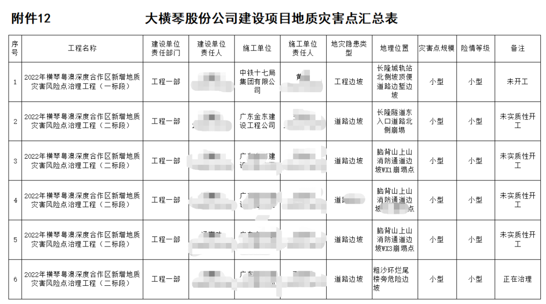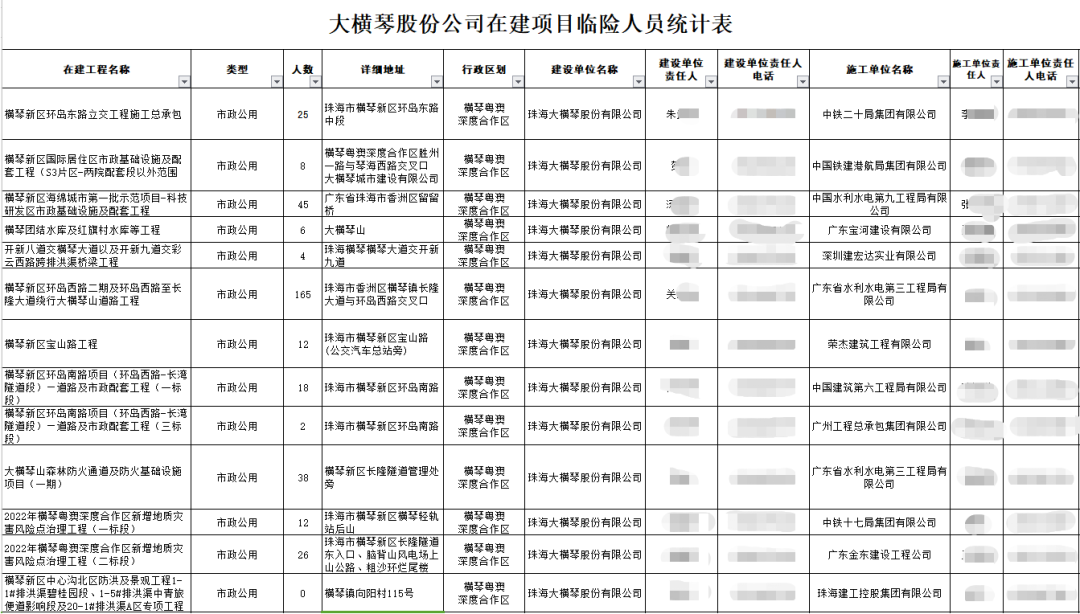 股份公司目前負責建設和運營項目共25個,涉及市政公用、道路、隧道、橋梁、水上等多個領域,涉及臨險轉(zhuǎn)移人員共2885人。公司已提前布局,對公司管理責任范圍內(nèi)的地質(zhì)災害點、排洪渠、建設工地等隱患點,進行系統(tǒng)排查。據(jù)統(tǒng)計,今年公司責任區(qū)域內(nèi)隱患點共16處,橫琴7處、富山9處,主要包括2022年橫琴粵澳深度合作區(qū)新增地質(zhì)災害風險點治理工程(一標段),富山工業(yè)園二圍北片區(qū)二圍北市政配套項目、高標準廠房一期項目、富山工業(yè)城二圍北片區(qū)廠房一標段項目等。