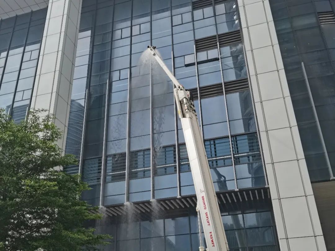 (6)橫琴消防救援大隊(duì)——使用高空水泡消防車(chē)對(duì)現(xiàn)場(chǎng)失火樓層位置進(jìn)行高空噴水;橫琴消防救援大隊(duì)與滅火行動(dòng)組里應(yīng)外合,形成合圍之勢(shì),將“火災(zāi)現(xiàn)場(chǎng)”進(jìn)行處置;