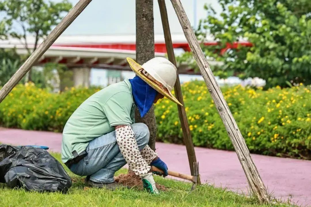 今年三月,琴建公司就對花海長廊三大開花喬木景觀區(qū)開始了樹盤梳理、打孔施肥、噴淋系統(tǒng)修復(fù)等工作,在樹木管養(yǎng)上做到未雨綢繆,在病蟲害防治等日常養(yǎng)護工作之外,提前檢查樹枝生長情況、及時修剪清理枯枝,防止枯枝掉落砸傷游人,有效預(yù)防并減少臺風(fēng)傷害。