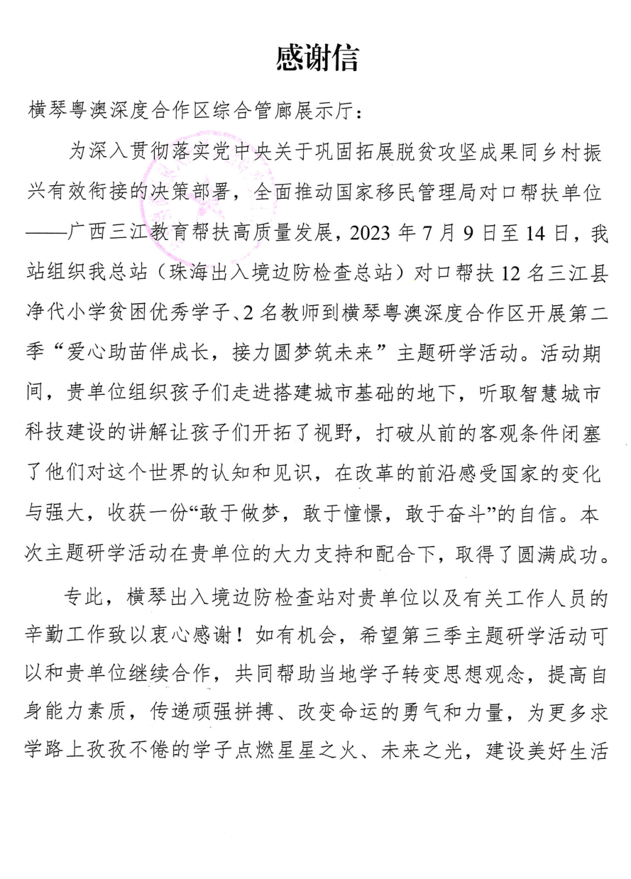積極協(xié)助橫琴出入境邊防檢查站的“愛(ài)心助苗伴成長(zhǎng),接力圓夢(mèng)筑未來(lái)”活動(dòng),從云端到地下娓娓介紹,幫助優(yōu)秀三江學(xué)子感知國(guó)際化都市的發(fā)展脈搏,了解智慧城市的科技建設(shè),得到橫琴出入境邊防檢查站和參觀學(xué)子的肯定和感謝。