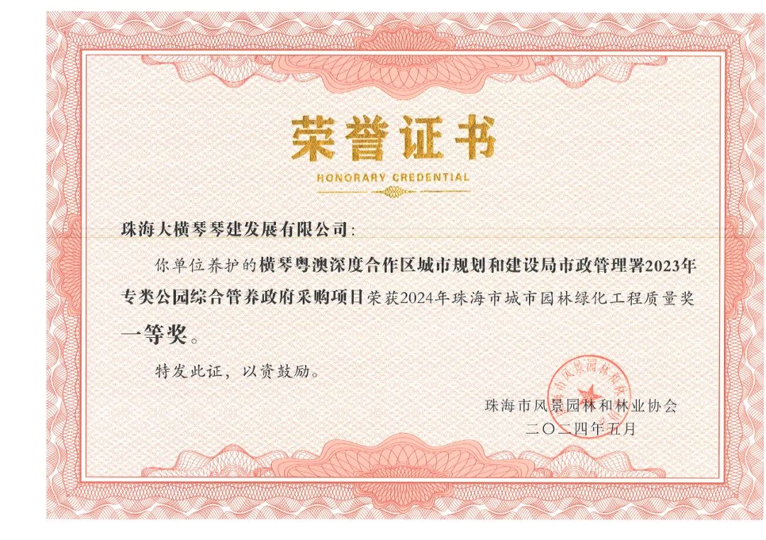 近日,珠海大橫琴集團(tuán)有限公司(以下簡稱大橫琴集團(tuán))下屬企業(yè)珠海大橫琴琴建發(fā)展有限公司所負(fù)責(zé)的生態(tài)養(yǎng)護(hù)與景觀建改項目接連獲得由珠海市風(fēng)景園林和林業(yè)協(xié)會頒發(fā)的多個獎項。