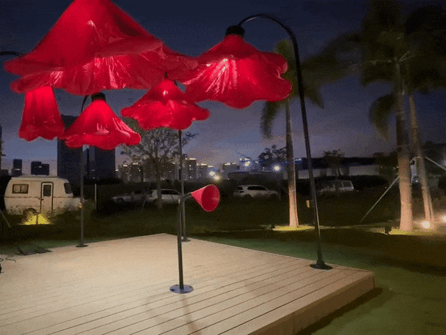 夜晚,當(dāng)游人經(jīng)過(guò),在喇叭裝置處說(shuō)出“熱烈慶祝中華人民共和國(guó)成立75周年”、“熱烈慶祝澳門回歸祖國(guó)25周年”等祝福語(yǔ)時(shí),花朵會(huì)自動(dòng)打開(kāi)并亮燈,創(chuàng)造出驚喜的互動(dòng)體驗(yàn)。