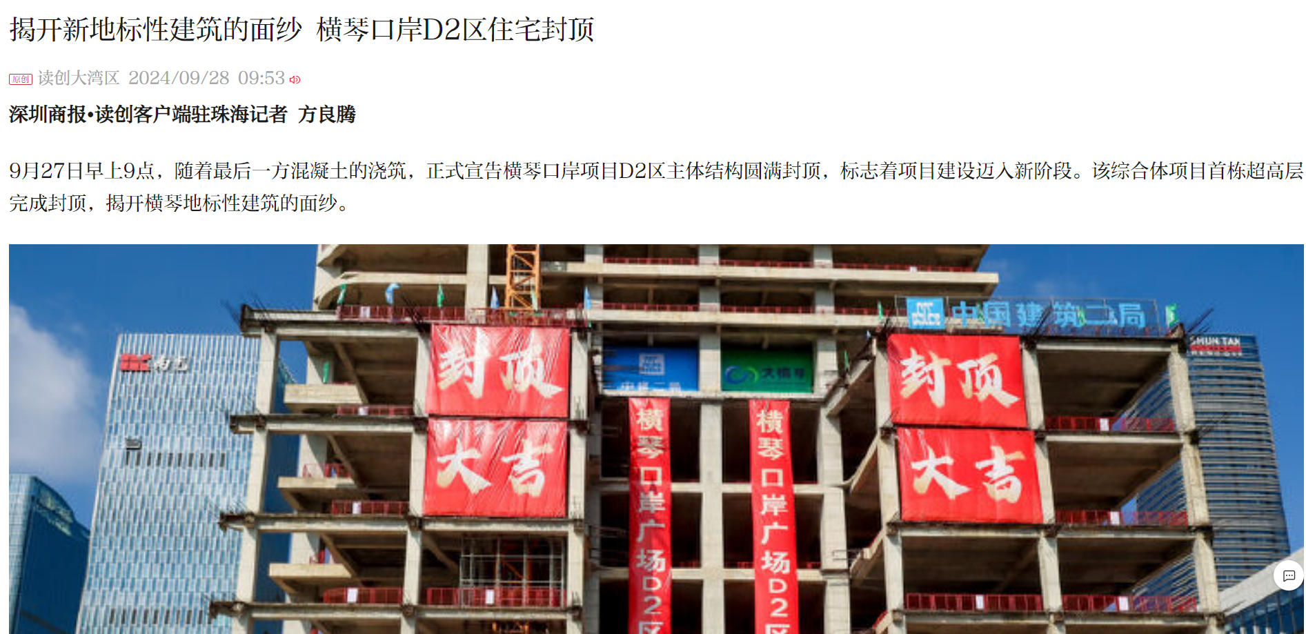 9月27日早上9點,隨著最后一方混凝土的澆筑,正式宣告橫琴口岸項目D2區(qū)主體結構圓滿封頂,標志著項目建設邁入新階段。該綜合體項目首棟超高層完成封頂,揭開橫琴地標性建筑的面紗。