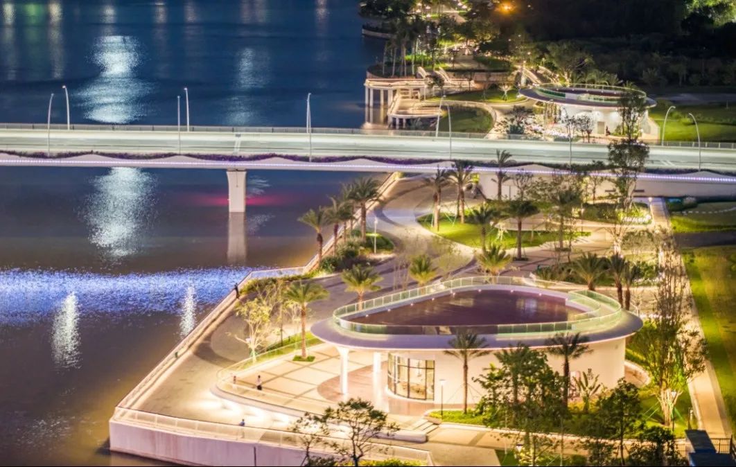 當(dāng)夜幕降臨,橫琴天沐琴臺(tái)絕美的夜景更加美輪美奐,震撼迷人,璀璨的燈光如同繁星般點(diǎn)綴在這把“古琴”之上,與周邊高樓大廈的霓虹燈共同組成一幅流動(dòng)畫卷。