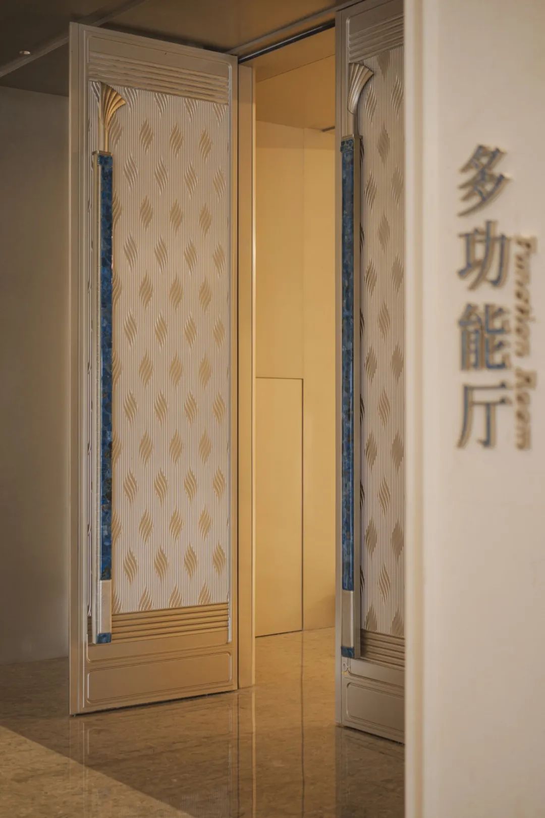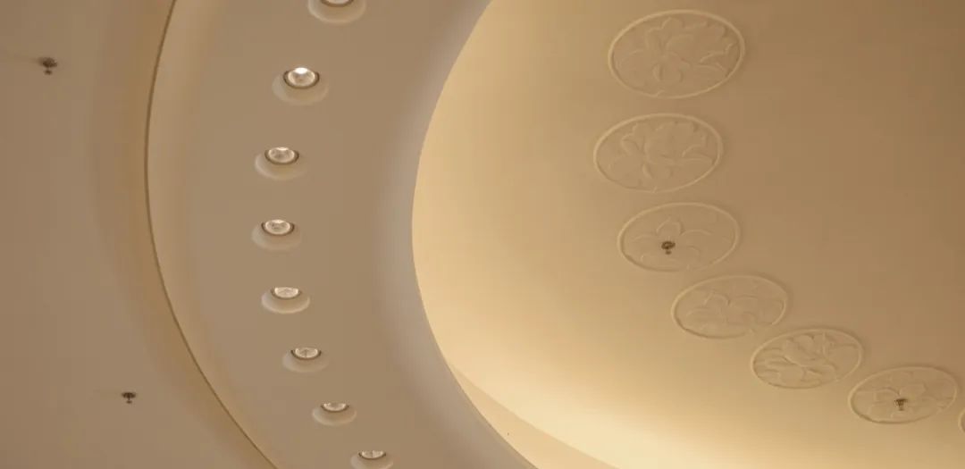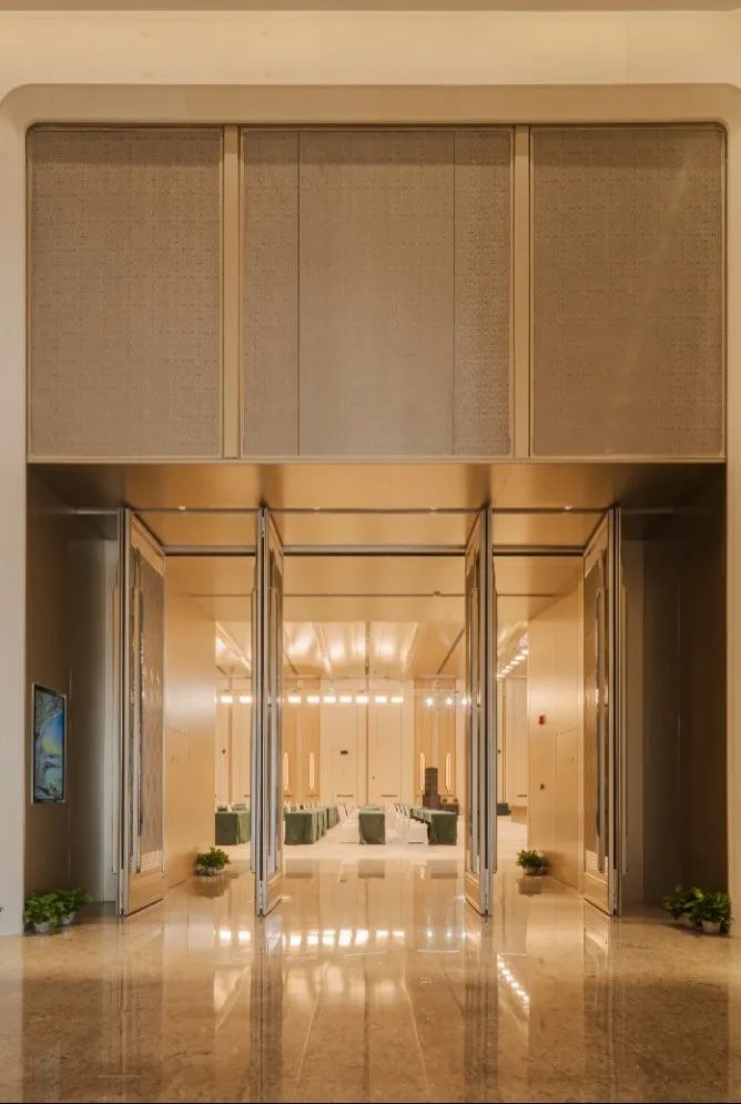 會(huì)議中心前廳頂面采用25朵花代表澳門回歸祖國25周年,造型中提取木棉花、蓮花寫意形體作為裝飾元素,圖案相互交錯(cuò),寓意“一國兩制”方針下粵澳共商、共建、共管、共享的新模式。
